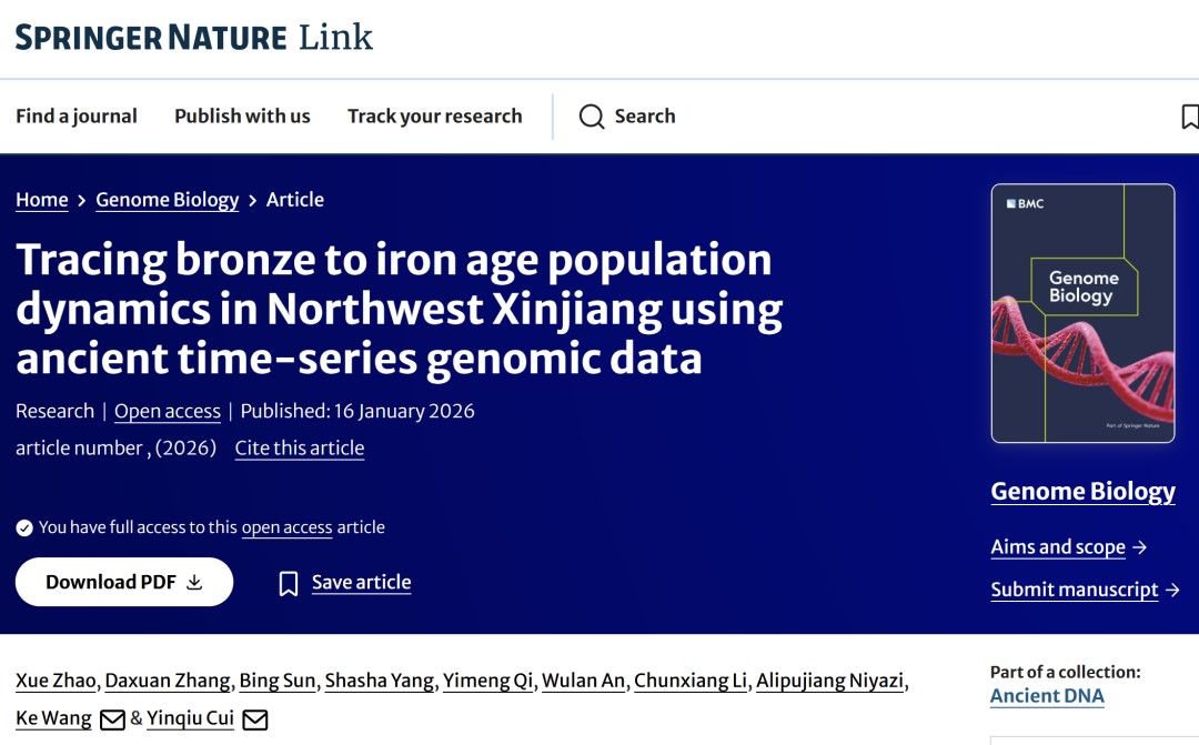 吉林大学生命科学学院崔银秋教授与复旦大学生命科学学院现代人类学教育部重点实验室王轲研究员团队利用古DNA技术,重建了新疆西北部那仁苏遗址人群长达2500年的连续遗传演化动态。该研究成果以“Tracing bronze to iron age population dynamics in Northwest Xinjiang using ancient time-series genomic data”为题,在国际权威学术期刊《Genome Biology》上发表。吉林大学生命科学学院博士生赵雪为论文第一作者,崔银秋教授、王轲研究员为共同通讯作者。